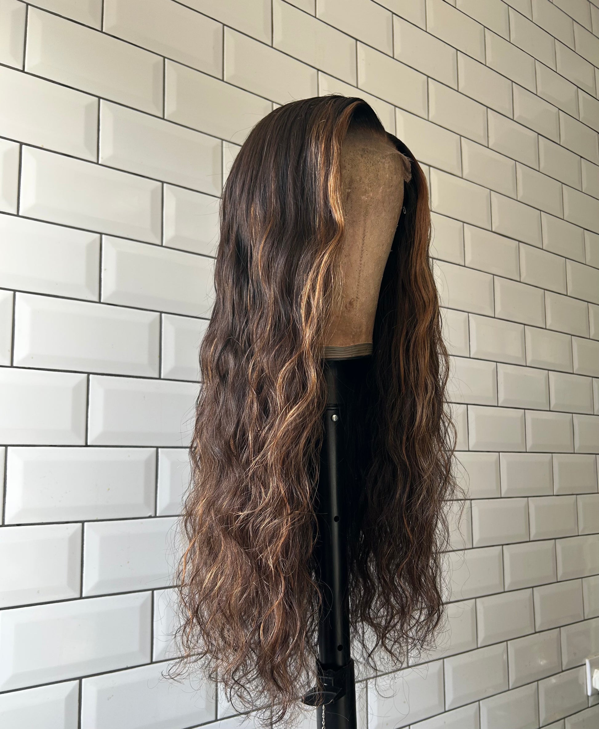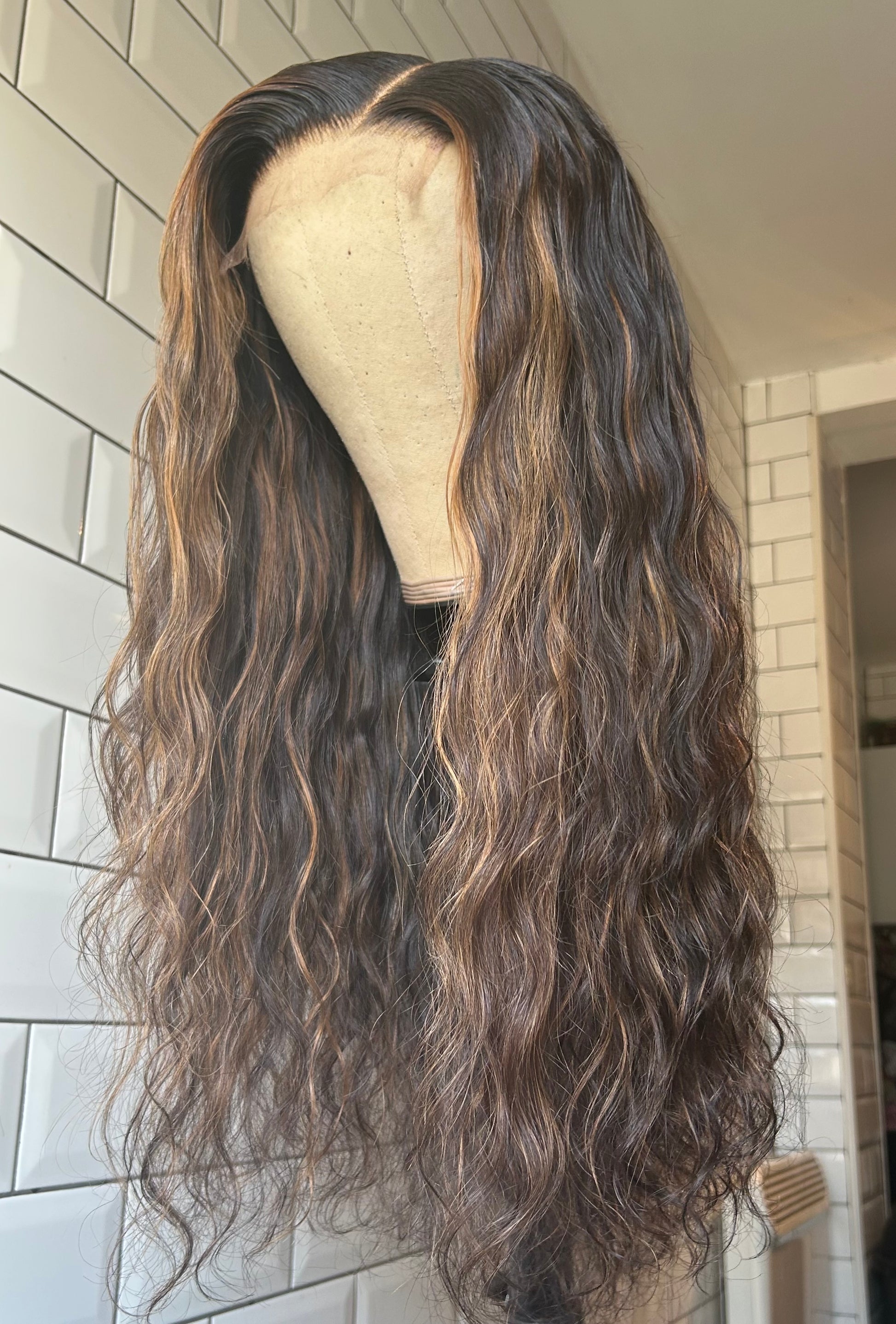 Loose wavy perfection. Face framing highlights with subtle peeps of colour throughout. A holiday fave!